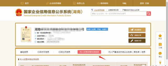 1、打開國家企業信用(yòng)信息公示系統(湖南),登錄首頁面,點擊“企業信用(yòng)信息”。2、輸入企業名稱點擊查詢3、點開“列入經營異常名錄信息”查詢結果詳情4、點擊後可以查看到,列入異常時間、列入異常名錄原因、作出列入機關、移出異名錄原因等信息。5、沒有顯示就是沒有異常!